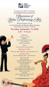 HOUSTON, TX—Arte Público Press, the country’s oldest and largest publisher dedicated to amplifying US Hispanic voices, will celebrate its 40th anniversary with a performing-arts showcase Thursday, September 15, 2022, from 6:30-9:30 pm at the University of Houston’s Moores Opera House (3333 Cullen Blvd, Houston, TX 77004).